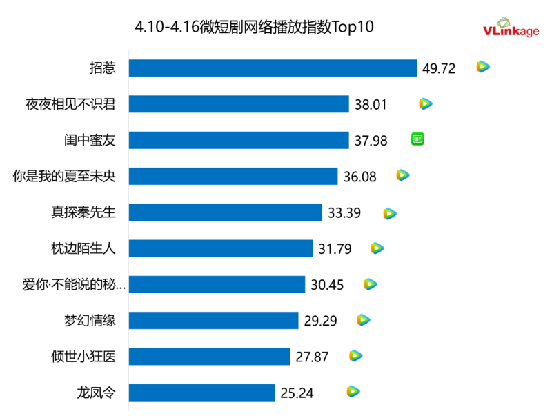在短剧赛道,《招惹》持续上分,,网播指数再次打破记录,达到49.72。在热度Top10的微短剧里,新上线的作品有3部,分别为《你是我的夏至未央》《枕边陌生人》和《爱你·不能说的秘密》。从平台来看,微短剧头部内容几乎被腾讯视频承包,90%的剧集均来自腾讯视频。