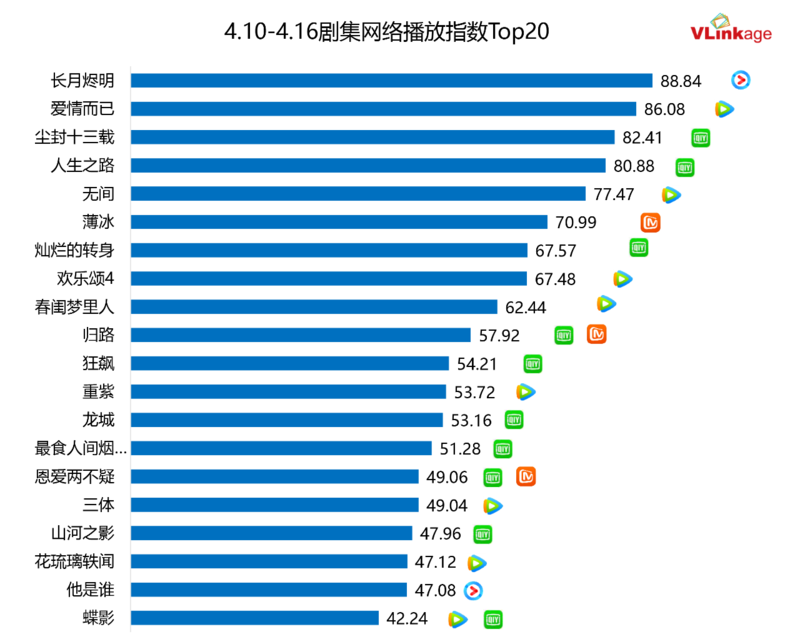 下图为上周V榜剧集热度Top20,《长月烬明》和《爱情而已》持续以高热度拿下冠亚军。排名第三的《尘封十三载》,热度量级从上上周的60+快速上涨至80+,低开高走,后劲十足。《他是谁》则从上上周的80+跌至40+,收官之后热度下跌迅猛。在大剧云集下,年代剧《人生之路》热度持续维持在80+,尤为难得。