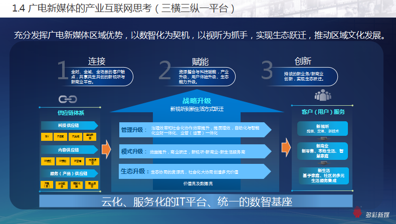 智慧化服务强调在统一数据基座及数据能力的基础上构建AI及业务中台的能力,在这个基础上实现客户的连接以及客户全场景的触点搜集、构建和服务。基于这块延展出来的新视听+的场景与服务体系,包括客厅、社区生活全业务的延展以及产业互联、产业服务的赋能。