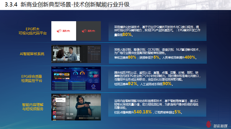 在技术创新方面,多彩新媒探索五年多研发出一些提升行业效率的技术和解决方案。例如,EPG可视化低代码平台技术,能让EPG开发效率提高80%,审核系统正确率已经可以达到90%,误报率非常低,可以让整体人工效率提升400%左右。再如,EPG质量的检测监控平台,基本上就是一个智能EPG、RPG的工具,能实现整体检测效率的提升、人工监测成本大幅降低。再如,运用内容智能理解与动态标签提取技术,基于智能推荐算法,通过以短带长深挖流量价值,助力短视频应用,为家庭用户提供极致的电视观看体验。