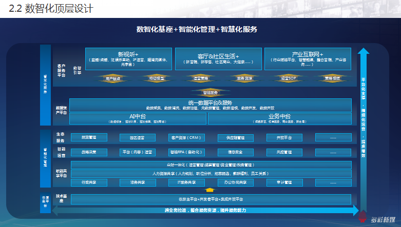 数实融合的顶层设计非常重要,我们做了三层,数智化基座+智能化管理+智慧化服务,三层技术架构设计。