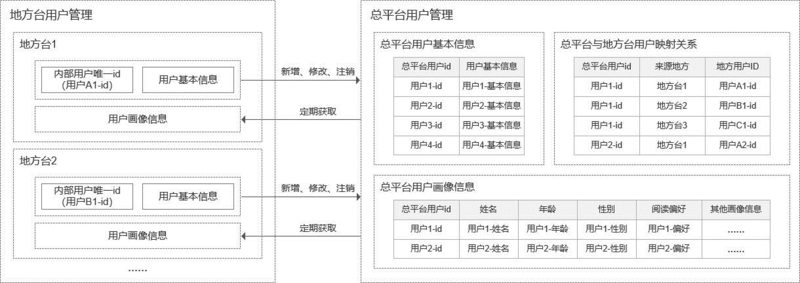 地方平台提供接口,总平台定期获取用户相关信息和用户画像,总平台综合各类信息,对不同地方平台的用户进行分析、拉通、归并。当用户状态发生变化时,地方平台及时通知总平台进行变更。