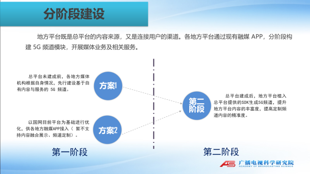 第一阶段有两种方案。方案一是总平台未建成前,各地方媒体机构根据自身情况,先行建设基于自有内容与服务的5G频道。方案二是以国网目前平台为基础进行优化,供各地方融媒APP接入(暂不支持内容融合展示、频道定制)。