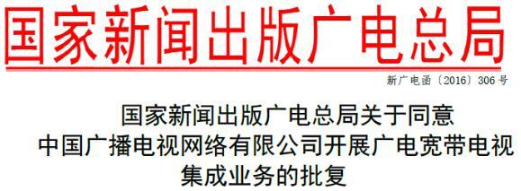 2016年,广电总局给了中国广电批复,同意后者建设和运营全国广电宽带电视集成平台,面向经有线电视网接入互联网的用户开展宽带电视集成业务。