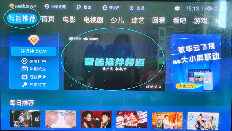 “智能推荐”目前在歌华有线属于重点推荐,在EPG所有频道的第一位,进入“智能推荐频道”,中间最醒目位置是这一频道视频流;同时,在“首页”频道的首屏,亦有“智能推荐频道”海报推荐位。