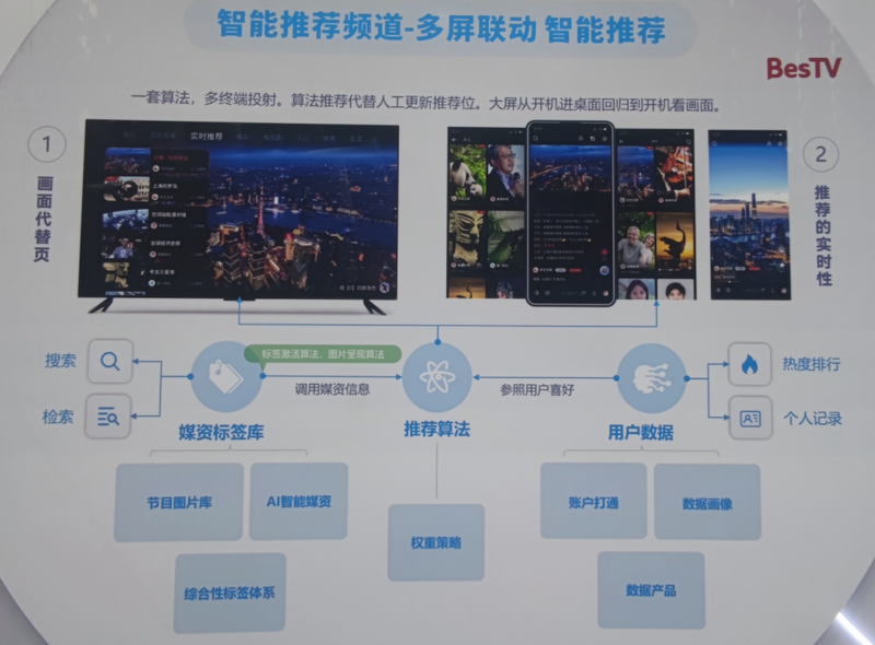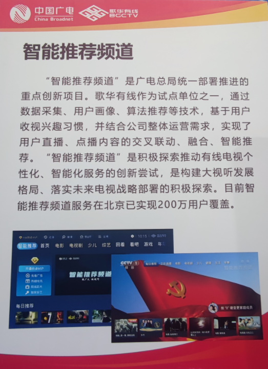 展览现场资料显示,目前智能推荐频道服务在北京已实现200用户覆盖,功能上实现了直播、点播内容的交叉联动、融合、智能推荐。