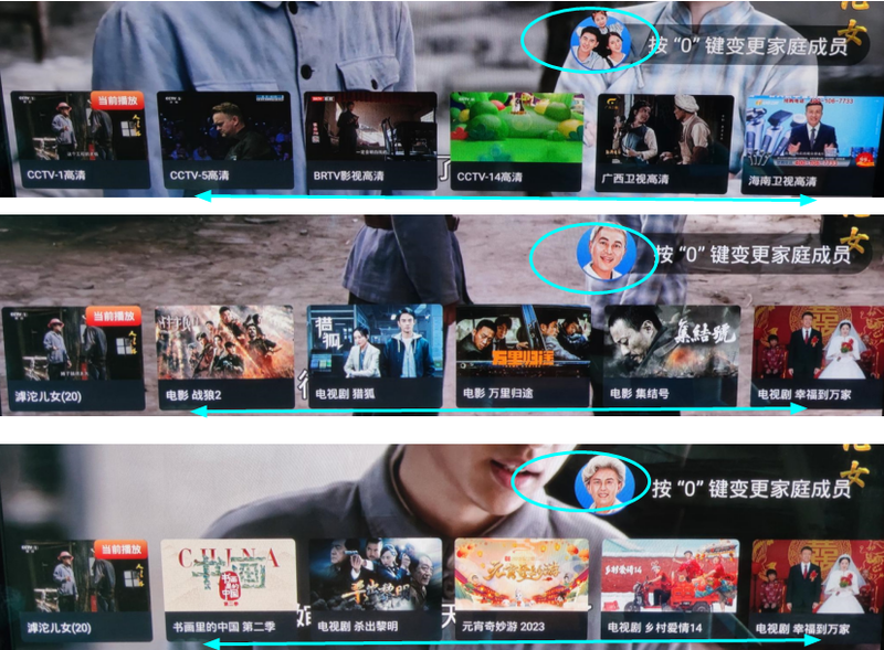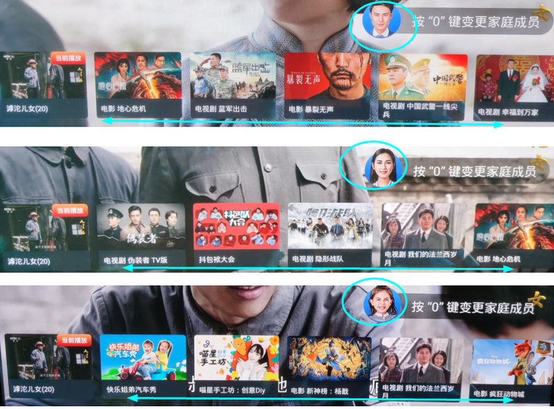 关于千人千面,可以在观看过程中随时切换用户,用户有家庭、爷爷、奶奶、爸爸、妈妈、男孩、女孩等不同维度,切换角色后获得的推荐内容不同。