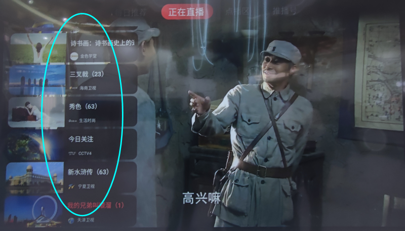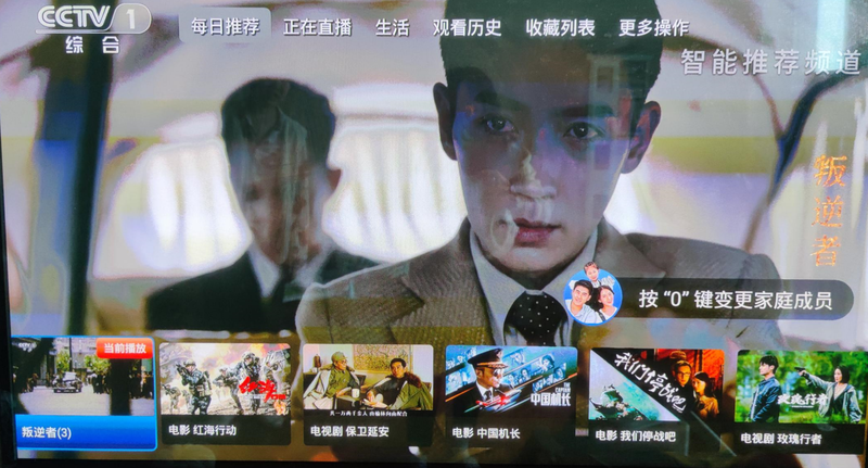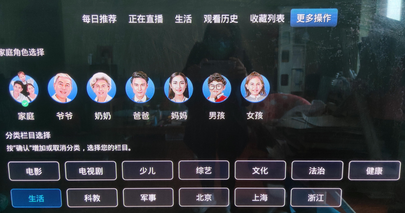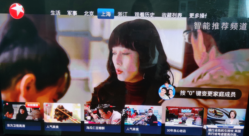除了每日推荐、正在直播等固定内容,还有很多可选项,观众可以根据自己的兴趣放进“智能推荐频道”中作为子栏目,例如,电影、电视剧、少儿、综艺、生活、军事等等,另外还有三个北京、上海、浙江三个试点地区的标签,汇聚当地各类频道等特色内容,不知道未来是不是覆盖其它区域时也都这样操作。