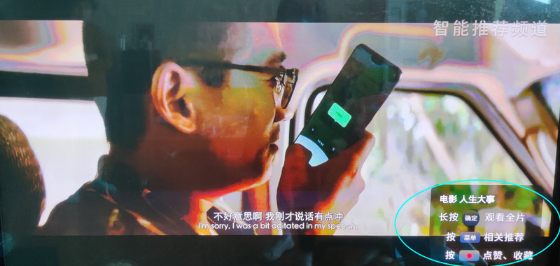 “智能推荐频道”推荐的内容有直播也有点播,直播内容是视频流,点播内容是海报。推荐位或者弹窗内容悬浮于视频上层,可以左右滑动查看推荐的内容,主屏幕视频流不变,也可以按上下键切换内容,视频流会随之变换。