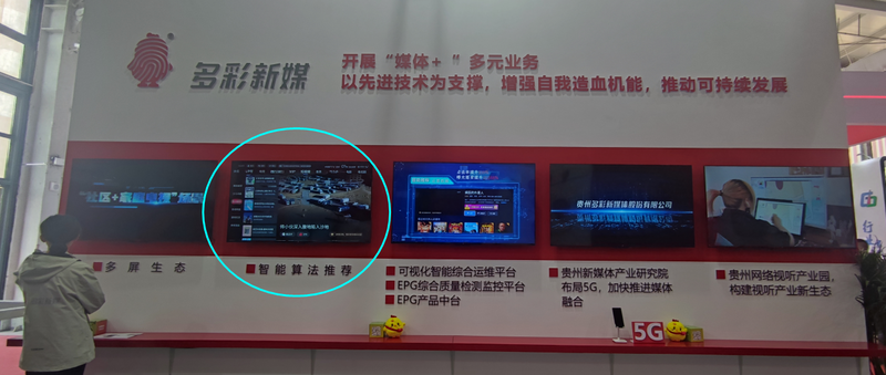 在其“媒体+ ”多元业务展区,展示了可视化智能综合运维平台、多屏生态、智能算法推荐等等,流媒体网记者因为刚好看了一圈有线的“智能推荐频道”,因此重点了解了一下多彩新媒(贵州广播电视台为多彩新媒控股股东,持有71.44%的股份)做的智能算法推荐。不过还是无奈的现场网络问题,只能看demo,无法全面操作。