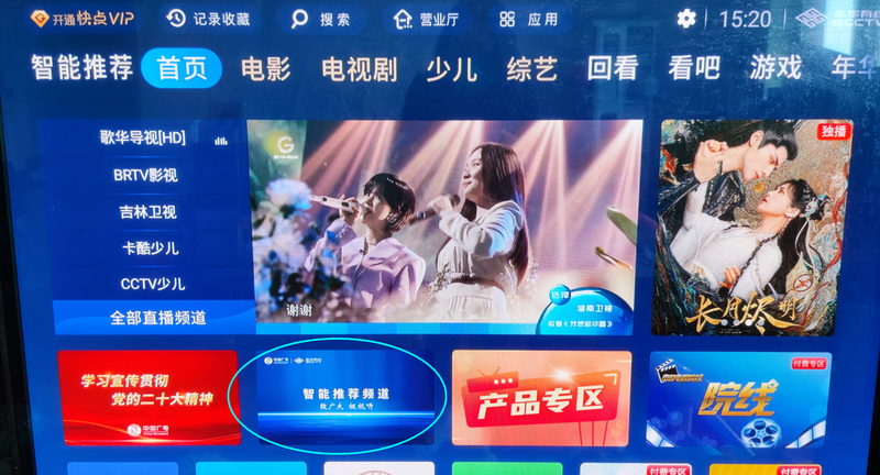 在CCBN2023展会现场,我们看到了北京、上海、杭州三地的“智能推荐频道”。只是因为网络原因,现场展示的基本是demo。在推荐位的具体呈现方式上,歌华的界面与demo演示中百视通和华数的不太一样,歌华的推荐位处在屏幕下方,百视通在左侧,华数则在右侧。
