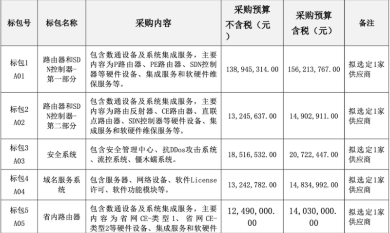4月26日,中国广电网络股份有限公司发布《IP骨干网建设项目(一期)数通系统采购项目》招标公告。本项目分为5个标包,含税预算为2.2亿元。本次招标其中的4个标段,如下: