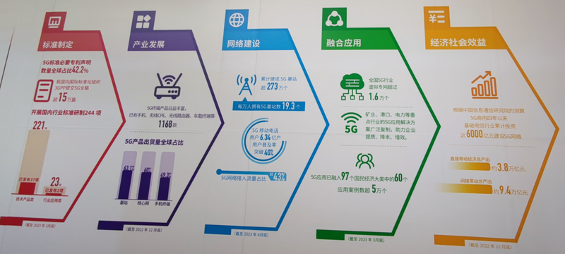 截至2022年底,已有手机、无线CPE、无线路由器、车载终端等5G终端产品1168款,其中5G产品出货量全球占比基站为63.1%、核心网60%、手机终端49.3%。截至2023年4月底,累计建成5G基站超273万个,5G移动电话用户达6.34亿户。