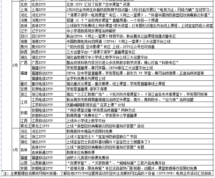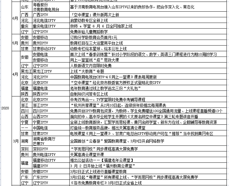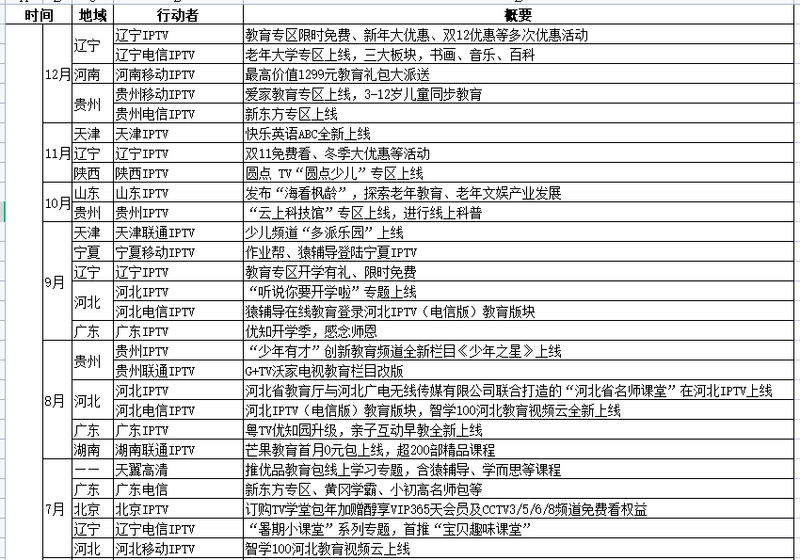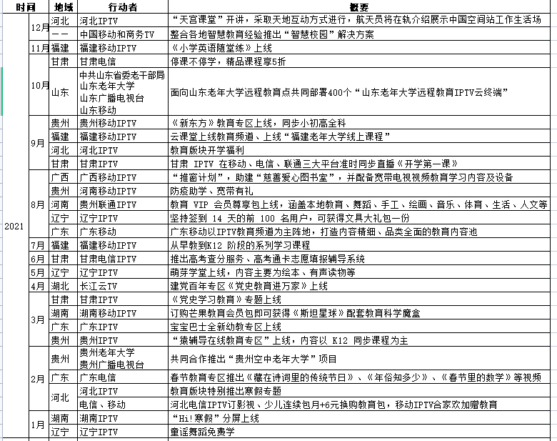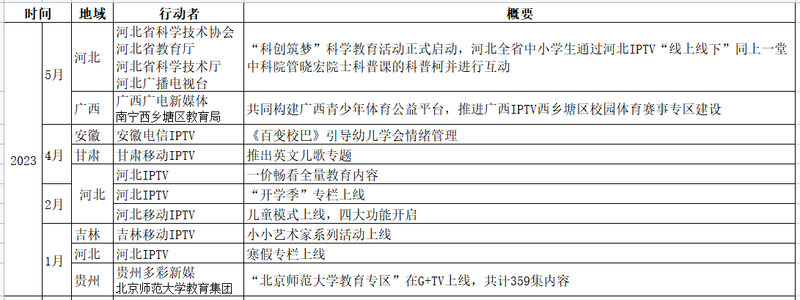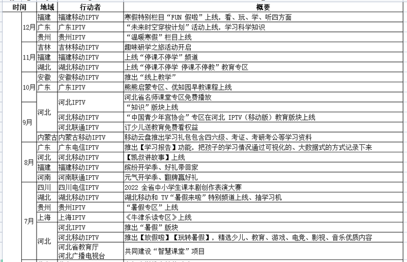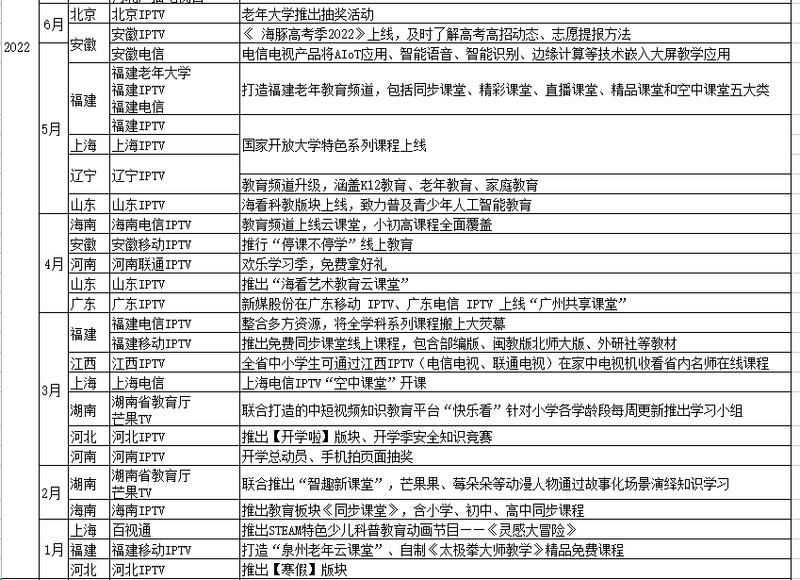 以下2020-2023年的IPTV教育活动主要梳理自流媒体网此前报道,了解每月各地IPTV/DVB运营商活动欢迎关注流媒体网出品的《各省(IPTV/DVB)电视业务活动汇总报告》(月度)。