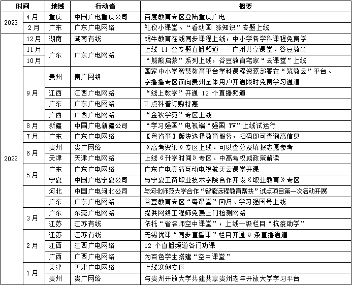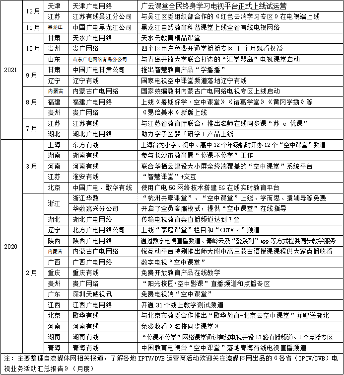 2020年是大屏勇于担起“停课不停学”的责任,各地IPTV、各地有线都积极参与进了那一次全国性的“空中课堂”行动,我们表格统计到的肯定仅是其中的一小部分。尤其集中在2020年2月、3月,各地有线主要是为“空中课堂”做好频道保障、网络保障以及技术支撑,比如有的地方有线全员化身客服随时回答家长疑问,很好的助力学生家长完成了线下转线上的过渡。
