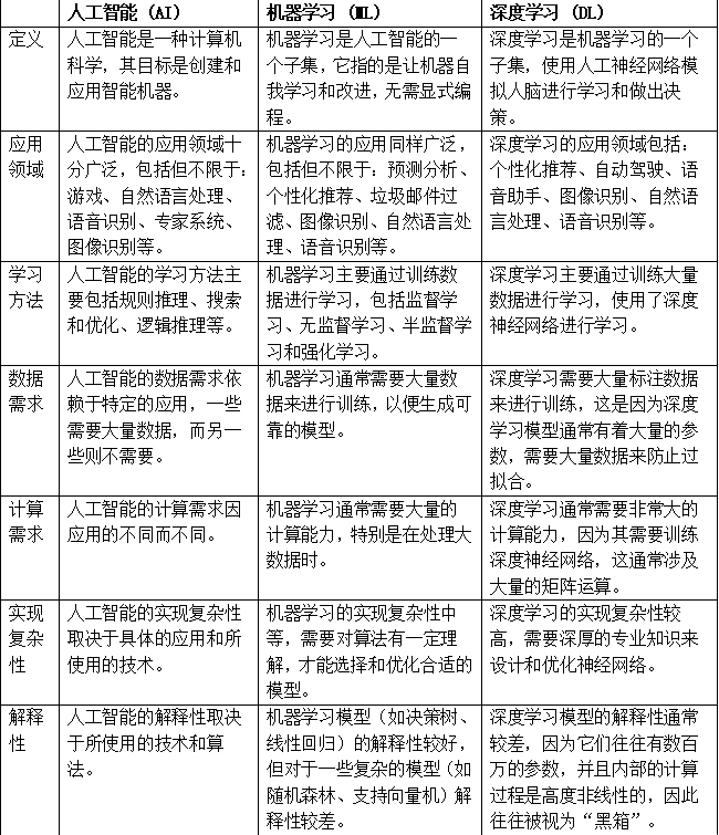 为了让读者对这些概念有一个更全面的理解,我们可以通过对比AI、ML和DL的关键特性来创建一张表格。在该表格中,我们比较了诸如定义、应用、学习方法、数据需求和计算需求等属性。
