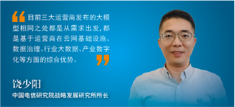 对于三大运营商目前发布的大模型产品的异同,饶少阳表示,目前三大运营商发布的大模型相同之处,都是从需求出发,以特定的应用场景和行业需求来牵引大模型开发和训练。