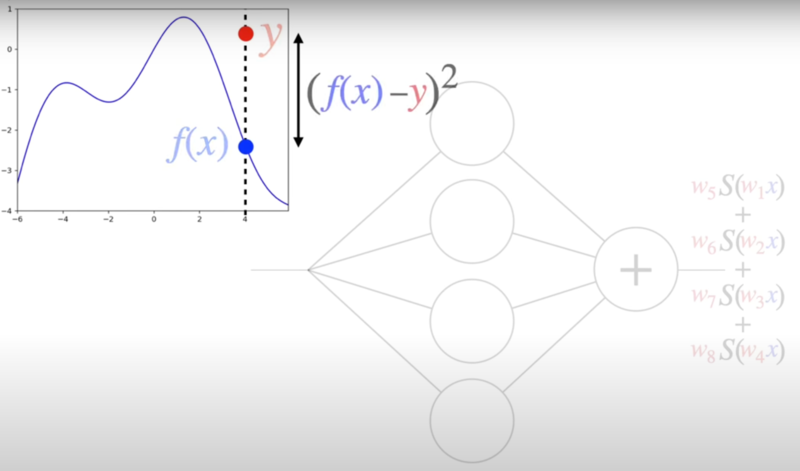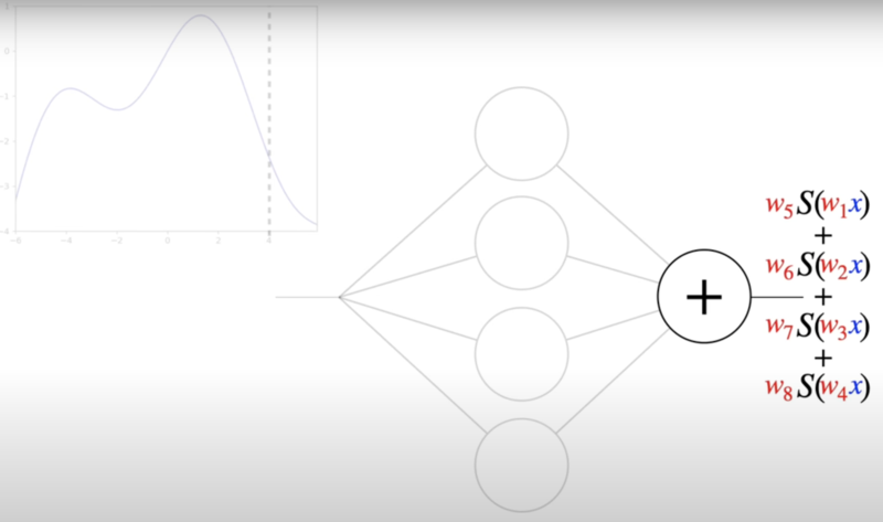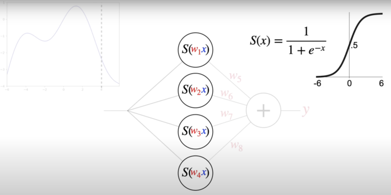接下来,每个加权副本会通过一个名为sigmoid的S型曲线激活函数进行处理,然后乘以新的权重并加起来。这个结果,我们称之为y,是对函数f(x)的近似值。