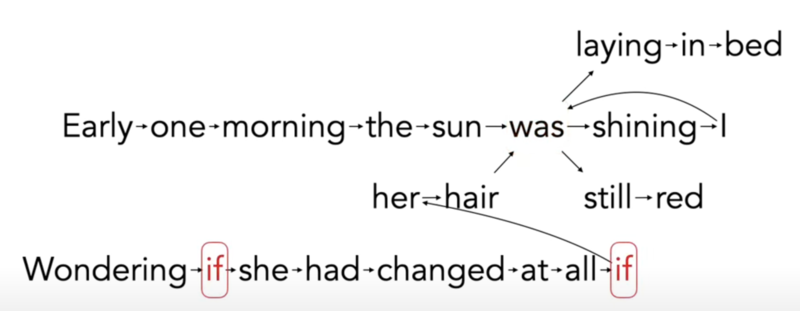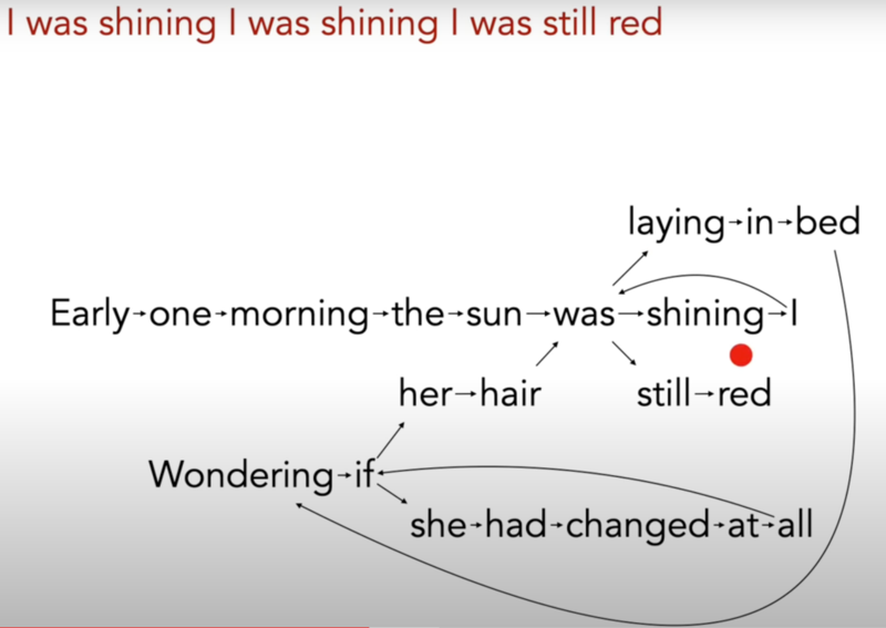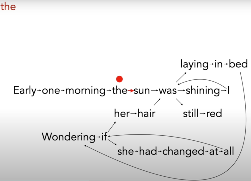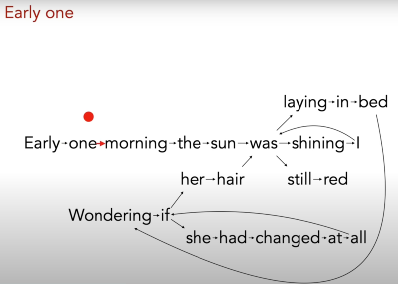 举例来说,如果从单词"early"开始,可以按照图中红点从左至右逐字地遵循正确的分支序列,我们将逐步还原鲍勃原始的歌词,“Early one ...”。
