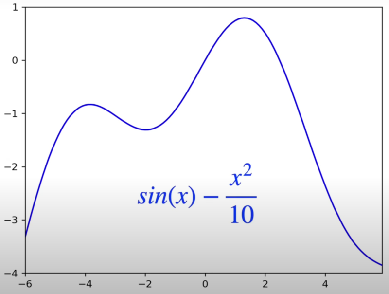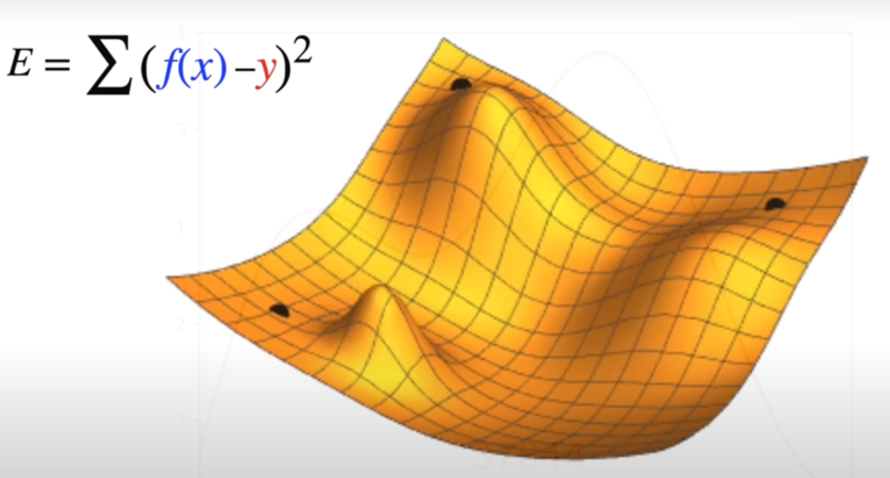 上述函数近似过程,另外一种理解方法是,我们可以将误差函数看作是一种地形图,目标就是寻找最低点或者说是最低的盆地。如果我们能直接看到整个函数的图形,那么寻找最低点相对比较直接。但在实际情况中,我们往往无法直接看到整个函数,就像是在雾中寻找方向一样困难。