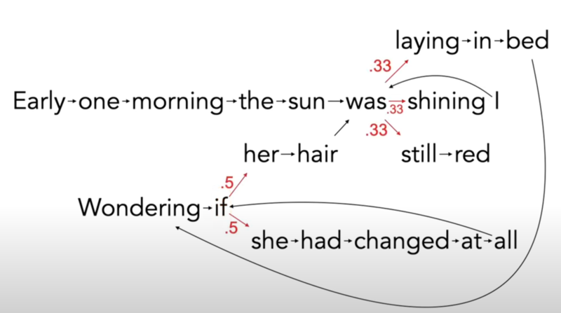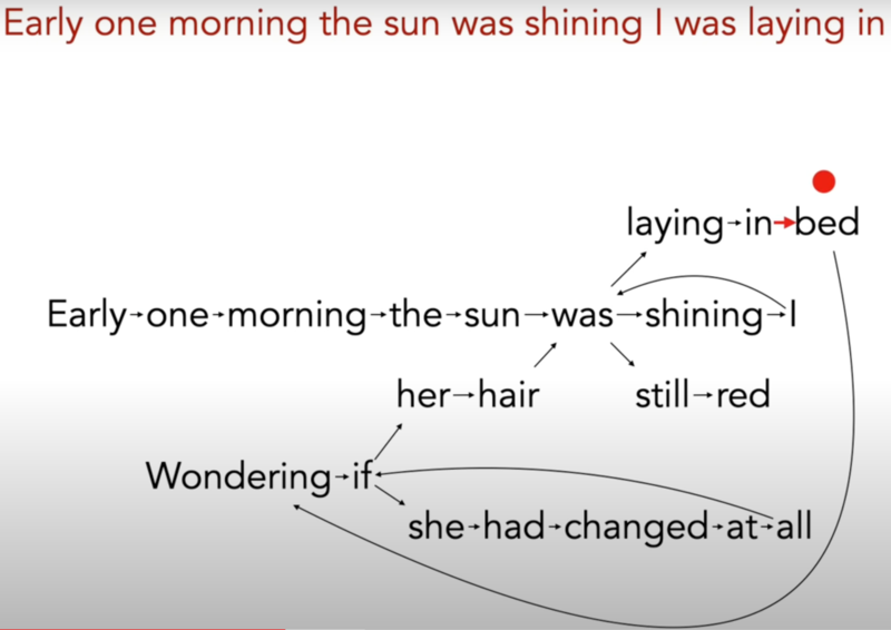 当遇到多路径的分叉口时,可以根据后续路径可能出现的概率进行选着生成,这里我们选择原歌词的路径,如此类推... 。“Early one morning the sun was shining I was laying in ...”。