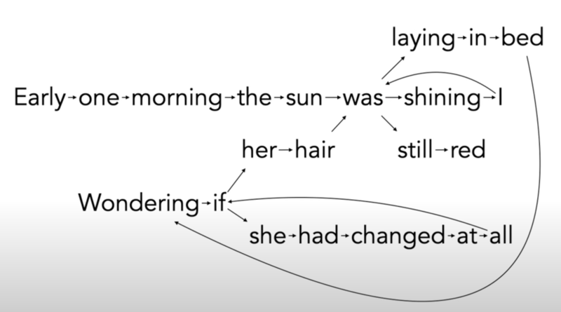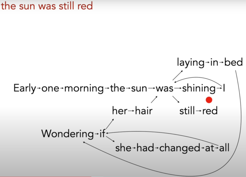 把文本视为时间序列是理解语言模型如何工作的一个关键概念。在这个视角下,每个单词都可以视为受到它前面单词影响的结果。通过这种方式,模型可以学习词序列的统计规律,预测接下来可能出现的词。如果我们在这些边上添加概率,它就成为了一个语言模型,你可以使用它来生成像鲍勃·迪伦那样的文字。