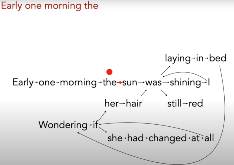 当红点依次移动时,如果没有分叉就把当前的单词作为预测的单词生成出来。 “Early one morning the ...”。
