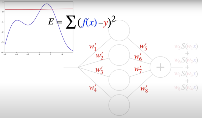 然后,我们定义一个误差函数,该函数的目标是累计所有这些红线和蓝线之间的差异。这些误差将被用来更新权重,这个过程我们称之为神经网络的训练。