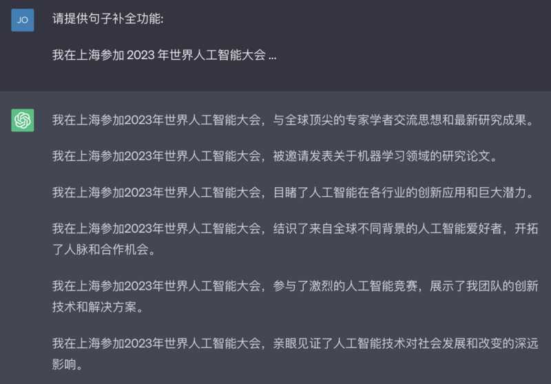 同样的,语言模型也会通过类似的方法预测你接下来可能要输入的词汇或者短语。这一切,都是大语言模型工作的一部分。目前很多AI工具都有当语句补全功能,比如,当我们要求 ChatGPT 对输入“我在上海参加 2023 年世界人工智能大会...”时,工具会按照一定的规则,给出建议的多个句子,我们可以根据自己的需要,进行选用,这极大地方便了我们的日常工作。