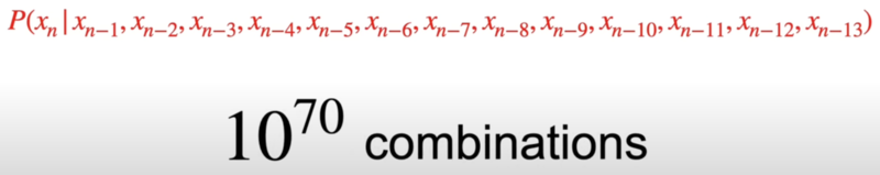 当然我们还是可以通过采用更长的条件概率函数来进行下一个单词的预测,比如采用如下的条件概率函数,即当前单词出现的概率和其前面 13 个单词都一起出现的情形有关系。下图给出了这种组合的可能情形,由图可以看出,这种组合的可能性太多了,为此我们需要寻求更好的解决方案。