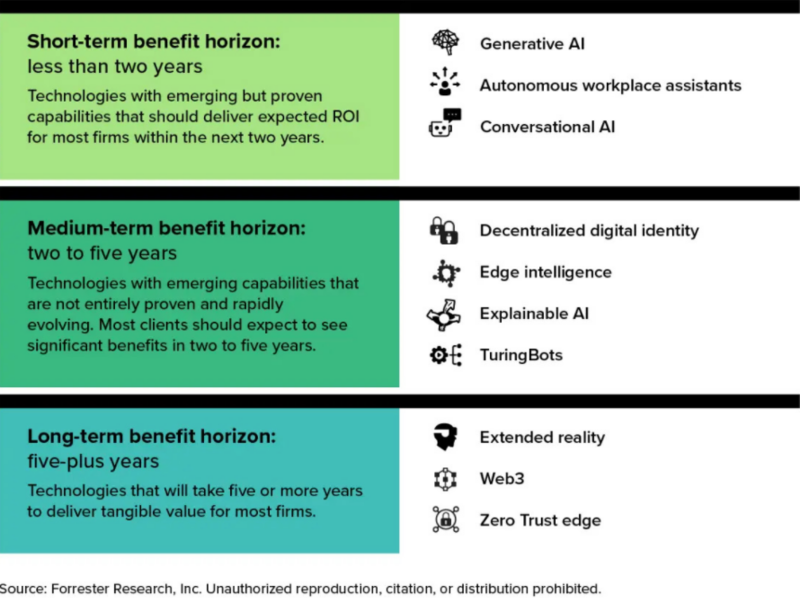 其中,短期技术包括生成式 AI、自主工作场所助理和对话式 AI,Forrester 认为这批 AI 技术在当下更多占据行业主导地位,并能够使企业快速受益。中期技术包括去中心化数字身份、边缘智能、可解释的人工智能和图灵机器人。长期技术则包含扩展现实、Web3 和零信任边缘,Forrester 认为这些技术虽然当下并不是“摇钱树”,但积极部署相关技术依然能在未来令企业得到更多发展空间。