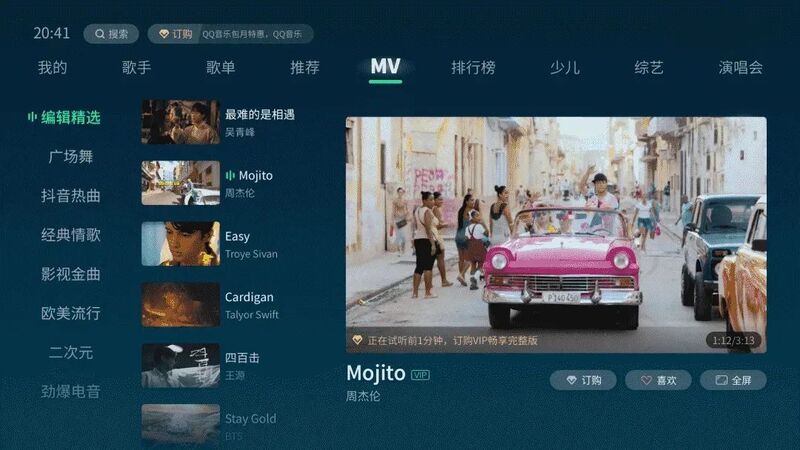 以演唱会、MV优质视频资源为主,满足用户视觉体验需求,全网络各平台互动直播、大屏幕看演唱会更过瘾。