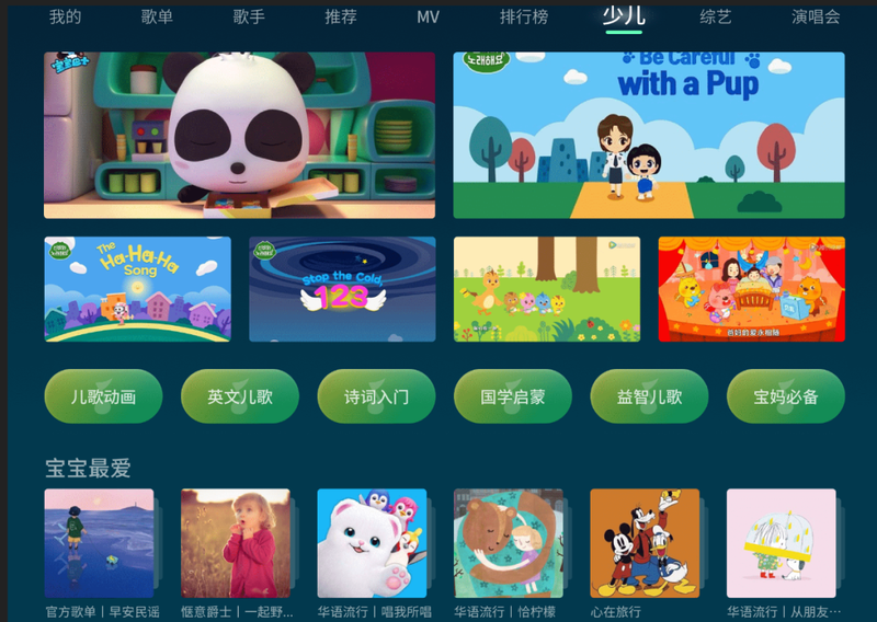 “多彩时光音乐”专区增设少儿栏目,儿歌种类齐全,针对不同年龄段的孩子,都能找到适合自己的歌,让孩子们爱上听歌。