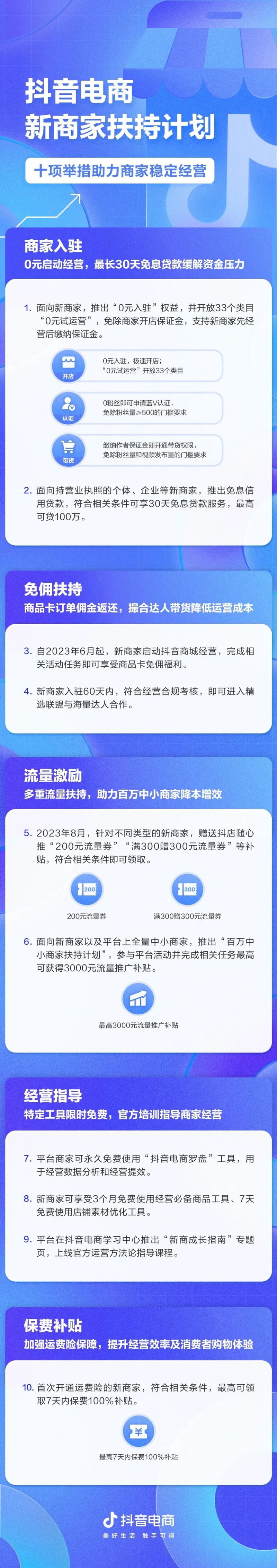 8月24日,“抖音电商新商家扶持计划”开启,在商家入驻、免佣扶持、经营指导、流量激励、保费补贴等方面推出十项举措,扶持新商家在平台快速启动经营,助力中小商家降本增效,在平台稳定成长。新商家通过“抖音电商学习中心”或“抖店”网站可查看并参与此次计划活动。