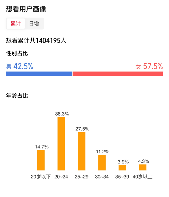 在流行“独立大女主”人设的当下,“不婚”正在成为一种潮流,各类“婚后痛苦说明书“屡见不鲜,尤其是在部分由女性用户主导的社交平台上。而据猫眼专业版数据,在《前任4》目前的想看用户中女性观众的占比达到57.5%。