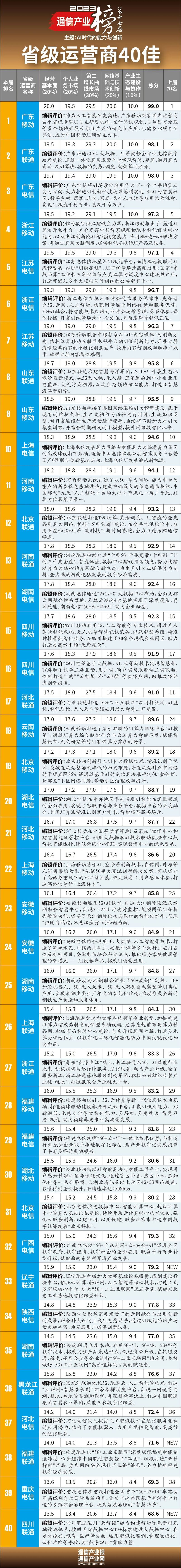 近日消息,通信产业网发布2023年四大运营商40强榜单,名单如下: