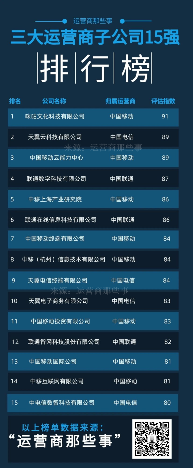 从榜单来看,中国移动有8家子公司上榜,中国电信和中国联通分别有4家和3家公司上榜。