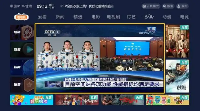 省广电总台IPTV集成播控分平台、中国广电甘肃网络股份有限公司、甘肃电信、甘肃移动、甘肃联通等有关单位已完成了新版电视节目指南界面设计,优化了回看和免费业务专区及看电视首页布局,将现有免费内容在各栏目首屏聚合,将“直播”“甘肃”“爱看”等免费节目内容置于首页首屏明显位置,优化导航栏,新增免费内容近50%。
