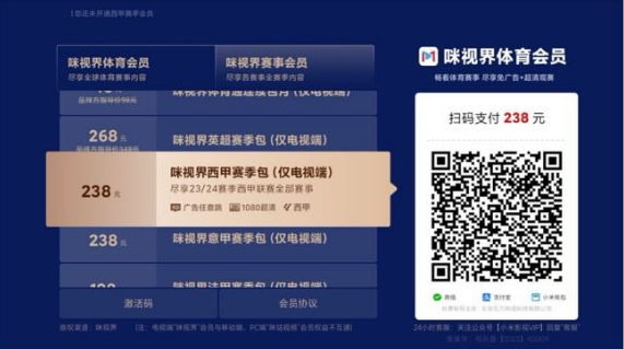 (二)赛事会员。赛事会员有6种产品包结构,分别为体育通连续包月【仅电视端】(首次支付48元,次月起每月自动续费98元)、英超赛季包【仅电视端】 (268元/季)、西甲赛季包【仅电视端】(238元/季)、意甲赛季包【仅电视端】(238元/季)、法甲赛季包【仅电视端】 (198元/季)、UFC年卡【仅电视端】 (128元/年)。