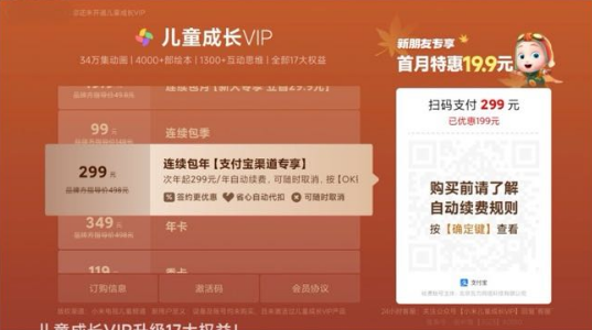 二、小米儿童成长VIP,有6种产品包结构,分别为连续包月(首次支付19.9元,次月起每月自动续费39.9元)、连续包季(首次支付99元,次季起每季自动续费99元)、连续包年【支付宝渠道专享】(首次支付299元,次年起每年自动续费299元)、年卡(349元/年)、季卡(119元/季)、月卡(49.8元/月)。