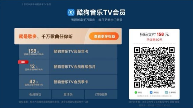 三、酷狗音乐会员,有4种产品包结构,分别为年卡(158元/年)、连续包月(首次支付12元,次月起每月自动续费12元)、季卡(12元/季)、月卡(15元/月)。