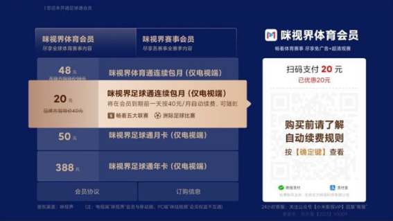 (一)体育会员。体育会员有4种产品包结构,分别为体育通连续包月【仅电视端】 (首次支付48元,次月起每月自动续费98元)、足球通连续包月【仅电视端】(首次支付20元,次月起每月自动续费40元)、足球通月卡【仅电视端】(50元/月)、足球通年卡【仅电视端】(388元/年);