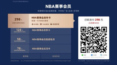 NBA 赛事会员,有4种产品包结构,分别为年卡 (298元/年)、季卡(128元/季) 、连续包月 (首次支付58元,次月起每月自动续费68元)、月卡(78元/月)。