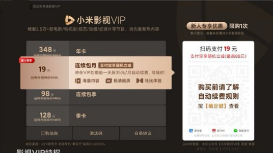 一、小米影视VIP。有5种产品包结构,分别为年卡(348元/年)、连续包月(首次支付19元,次月起每月自动续费35元)、连续包季(首次支付98元,次季起每季自动续费98元)、季卡(128元/季)、月卡(50元/月)。