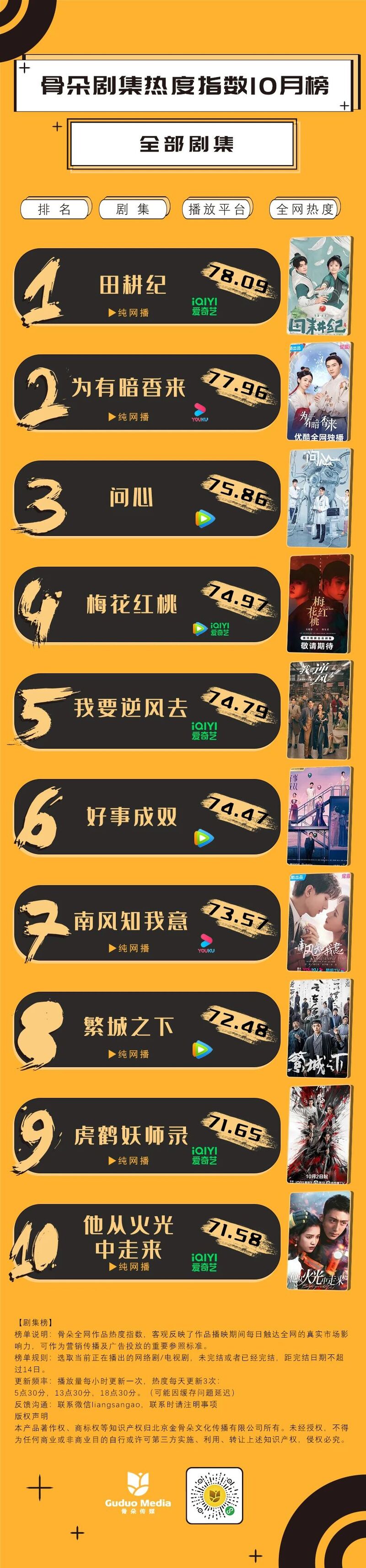 10月剧集市场整体略显平淡。骨朵热度最高的剧集为《田耕纪》,但78.09的热度值也要低于9月的榜首《好事成双》。紧随其后的是同为古偶剧的《为有暗香来》,这两部剧也是10月剧集月榜中唯二的两部古偶。