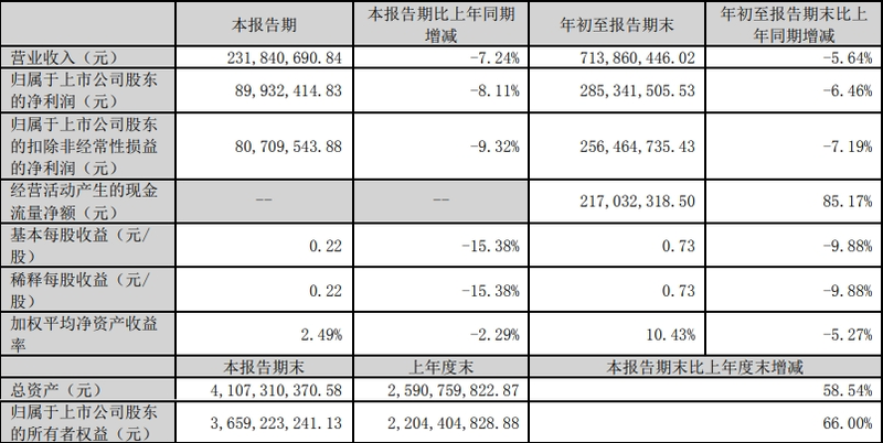 第三季度,海看股份共实现营业收入为2.32亿元,与上年同期相比减少了7.24%;归属于上市公司股东的净利润为8993.24万元,同比减少了8.11%。至本期末,其总资产为41.07亿元,归属于上市公司股东的所有者权益为36.59亿元。