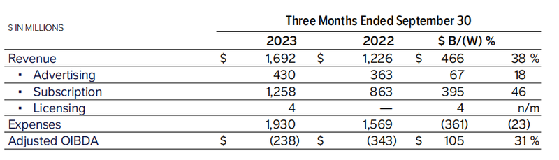 最受关注的是,在第三季度,流派拉蒙的媒体业务(D2C)收入同比增长38%到16.9亿美元,其中,流媒体的总订阅收入增长了46%,达到12.6亿美元。同时其流媒体广告收入增长了18%,这包括了Paramout+和FAST平台Pluto TV的广告增长——通过这两个平台的用户观阅时长增长了46%。Paramount+的总用户数为6300万,当季净增270万。由于服务价格上涨,Paramout+的ARPU同比增长16%。该公司还将流媒体业务的亏损从一年前的3.43亿美元收窄至2.38亿美元。在公司财报会议上,首席执行官Bob Bakish还表示,Paramout+和Showtime的结合正在产生效果。派拉蒙还预计,2023年全年的流媒体亏损将低于去年。