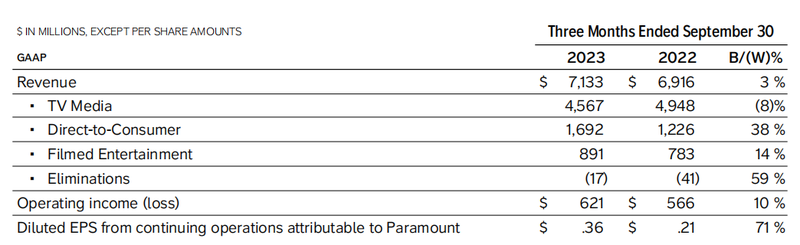 首席执行官Bob Bakish表示:“我们继续执行我们的战略,优先考虑在流媒体方面的审慎投资,同时最大限度地提高我们传统业务的收益。在第三季度,我们成功地增加了直接面向消费者的收入和Paramount+用户,同时将DTC损失缩小了30%以上。事实上,我们现在预计2023年DTC的亏损将低于2022年。展望未来,我们仍将在2024年实现公司总收入的大幅增长”。“虽然我们仍然专注于执行我们的战略,制作具有大众吸引力的世界级内容,跨平台交付并通过多种收入来源实现货币化,但随着行业的不断发展,我们从未像现在这样保持敏捷和适应性,”Bakish在公司的财报会议上说。