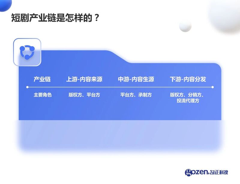 据勾正梳理,目前,微短剧行业生态日趋完善。上游为内容来源,角色分配在版权方、平台方。中游为内容生产,角色分配在平台方、承制方。下游为容分发,角色分配在版权方、分销方、广告代理商和投流代理商。