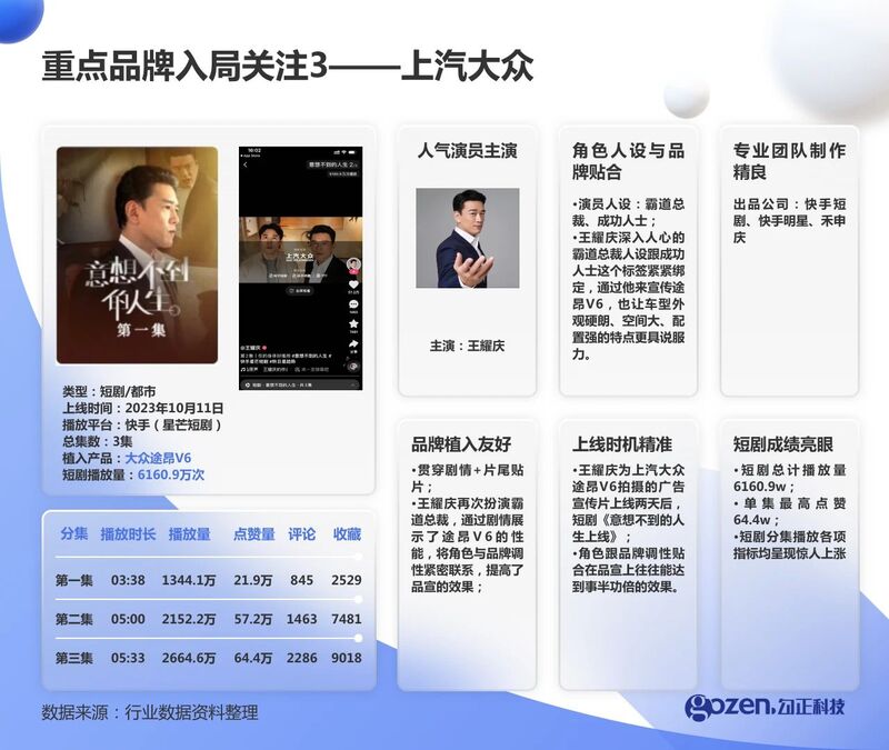 除了美妆,汽车品牌也开始投入短剧。在10月份,由王耀庆主演的短剧《意想不到的人生》中,以霸道总裁人设,通过剧情展示了一汽大众途昂V6的性能,将角色与品牌调性紧密联系,提高了品宣的效果;这部剧中,一起大众贯穿剧情,同时片尾贴片。